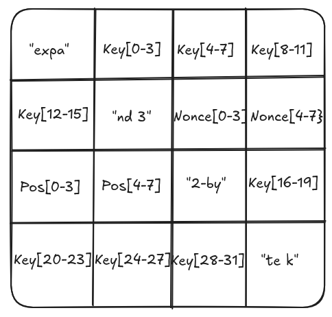 • construction d’un état de 4 x 4 mots de 32 bits. Les 4 mots diagonaux d’indice 0, 5, 10 et 15 sont les constantes de Salsa20 (« expa », « nd 3 », « 2-by » et « te k »).